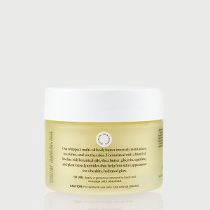 Our whipped, multi-oil body butter intensely moisturizes, nourishes, and soothes skin. Formulated with a blend of linoleic-rich botanical oils, shea butter, glycerin, squalane, and plant-based peptides that help firm skin’s appearance for a healthy, hydrated glow. Formulated with a blend of natural aromatic extracts with a vanilla and coconut scent.